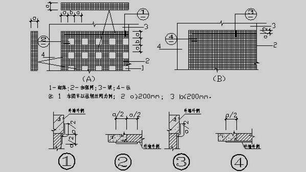 2、1—砌體;2—耐堿玻纖網(wǎng);3—梁;4—柱