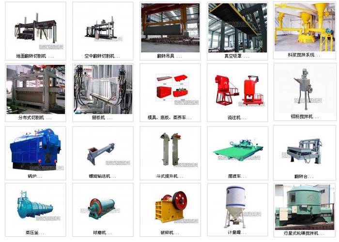 球磨機(jī),鄂式破碎機(jī),提升機(jī),皮帶輸送機(jī),渦流制漿機(jī),攪拌澆注機(jī),模具,切割設(shè)備,蒸養(yǎng)車,擺渡車,鍋爐蒸養(yǎng)釜設(shè)備,翻轉(zhuǎn)吊具,行車等設(shè)備。